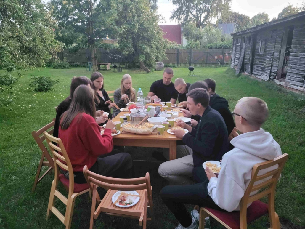 Kuna ilm oli soodne, õhtustasime värskes õhus. Kõigi osalejate kaasabil ja efektiivse tööjaotuse alusel valmisid imemaitsvad road nii grillil kui köögis ning pikast reisist tühjad kõhud said täidetud. Ühiselt süües ja tähtsate küsimuste üle arutledes andsid viimaks sääsed ja jahedus märku saabunud hilisõhtust ning otsustasime koosviibimise tuppa ümber kolida. Soojade jookide seltsis jätkasime vestlusõhtut koos mõne muusikalise etteastega kuni keskööni, mil rampväsinuina uinusime.