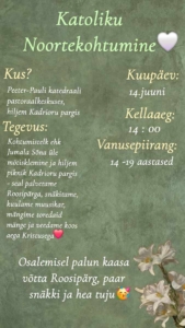 Saame kokku laupäeval, 14. juunil kell 14.00 Peeter-Pauli kiriku pastoraalkeskuses ja alustame meie noortekohtumist Jumala Sõnaga. Pärast seda suundume koos Kadrioru parki, kus teeme mõnusa pikniku – seal palvetame Roosipärga, snäkitame, kuulame muusikat, mängime toredaid mänge ja veedame koos aega Kristuses!